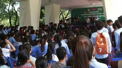 การชมดนตรีในแบบมิติใหม่ ยืนนิ่งไม่ไหวติงกันเลย เพราะว่าคนเยอะ (มหาวิทยาลัยภูมินทพนมเปญ)